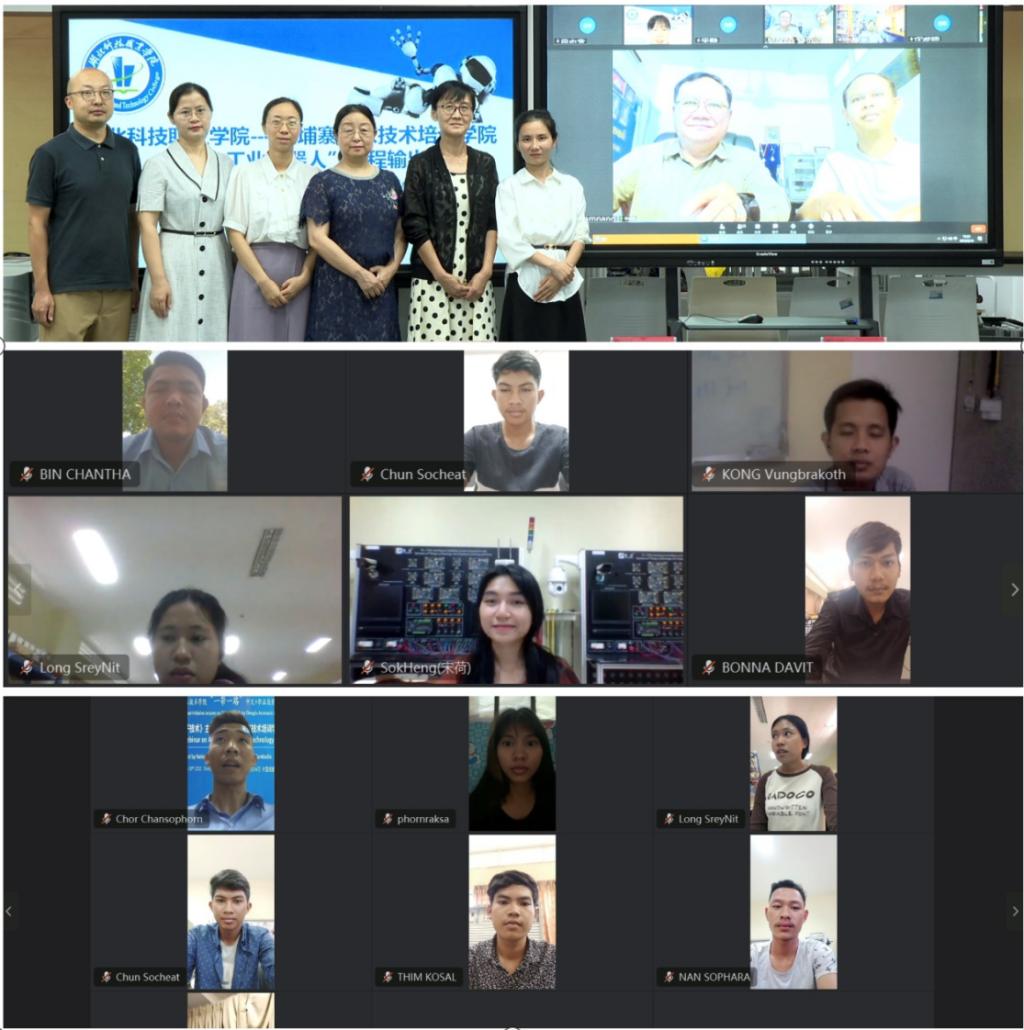 本网讯(通讯员 沈文捷 严翩/文 沈文捷 陶丽梅 李郁 詹昊/图)8月10日至16日,华体会正规平台对柬埔寨国家技术培训学院开展“中文+工业机器人”课程输出项目。课程输出开班仪式在10日举行,副校长汤春来教授、外事处、机电工程学院相关负责人、学校国家级职业教育教师教学创新团队(工业机器人技术)立项建设单位负责人和团队成员出席了仪式。柬埔寨国家技术培训学院副校长潘纳瑞恩、相关部门负责人以及师生在线出席了仪式。