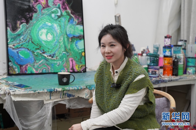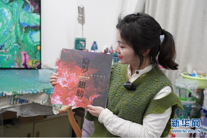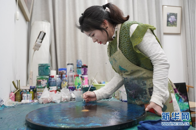 图为王娟娟在绘制丙烯画。新华网发陈周璇摄