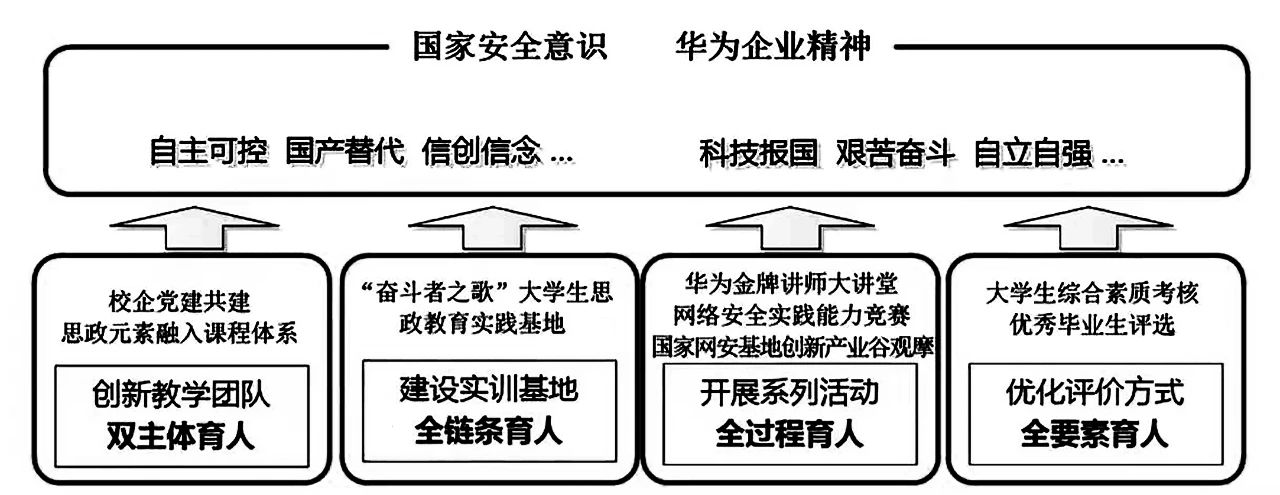 4、实施“四维并进”的课程思政举措,牢固树立学生国家安全观。将“科技报国情怀、艰苦奋斗精神、自信自强意识”等思政元素融入《路由交换技术》等课程,从四个维度,落实课程思政。与讯方等华为生态企业联合成立“校企联合党支部”,协调开展网络安全教育,强化科技报国意识;与华为联合建设“奋斗者之歌”大学生思政教育实践基地,体验真实文化环境,激发学生不畏艰苦、顽强拼搏精神;开办国家网络安全周、“华为金牌讲师大讲堂”、湖北网络安全实践能力竞赛和国家网安基地创新产业谷观摩等系列活动,树立学生自信自强和国家安全观意识;将国家安全观教育评价指标纳入《大学生综合素质考核》和《优秀毕业生评选》指标体系,强化成果应用。促进学生专业学习与国家安全发展战略同频共振,有效提升学生服务国家战略能力。