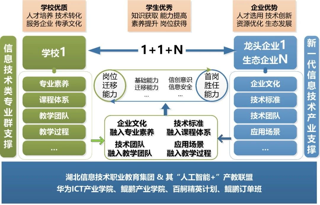 2、创建“1+1+N”人才培养协同机制,打造人才培养共同体。学校与华为及其96家生态企业合作,华为提供技术、标准,学校与生态企业应用华为技术培养生态企业所需人才,形成了“1+1+N”合作模式。联合90余所职业院校、200余家企业及4家行业协会成立了湖北信息技术职教集团及其“人工智能+”产教联盟,实现校企合作,资源共享;与华为共建了华为ICT学院、鲲鹏产业学院,成立理事会统筹产业学院运转,成立指导委员会执行理事会决策,实现专业对接产业,专业共建;实施百舸精英计划订单班项目,实现书证融通,人才共育。制定《华为ICT学院项目运行标准》等20余项制度,促进校企在经费投入、基地建设、“1+X”技术等级认证、课程建设、实习就业等方面合作,打造人才培养共同体。