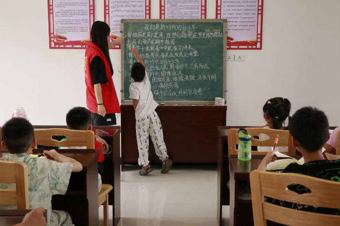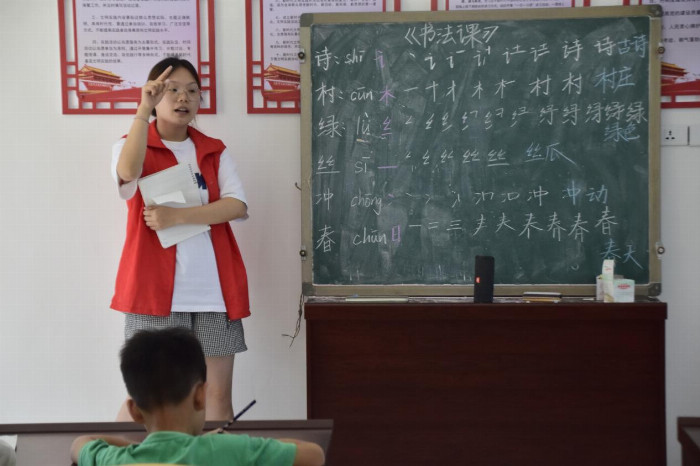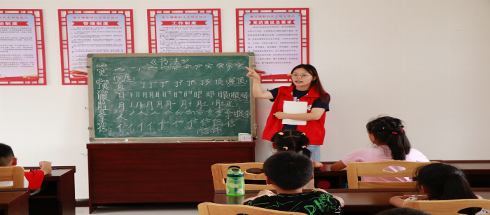 说普通话,写规范字。头雁实践队开展了“书正语纯·推普润心”暑期学堂。从最基本的部首开始,头雁实践队成员一笔一划地示范着字形的构造,从横平竖直到撇捺舒展,激发了同学们对汉字结构的好奇与喜爱,让小朋友们在书法中领会到不仅要学好普通话,更要写好中国字