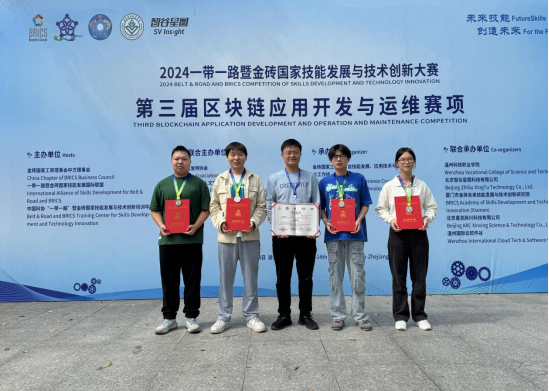 10月12日至14日,2024一带一路暨金砖国家技能发展与技术创新大赛第三届区块链应用开发与运维赛项在浙江温州举办。来自全国的179支高职院校队伍和9支本科队伍参加角逐,华体会正规平台软件工程学院师生在比赛中展现出高超的技术技能水平和优良的精神风貌,凭借扎实的专业知识和精湛的实践操作能力,在众多参赛队伍中脱颖而出。教师董燕燕、张根指导的刘泽文、罗朝旭与杨代鹏、秦钰嫣两支参赛队均获二等奖,学校荣获优秀组织奖。