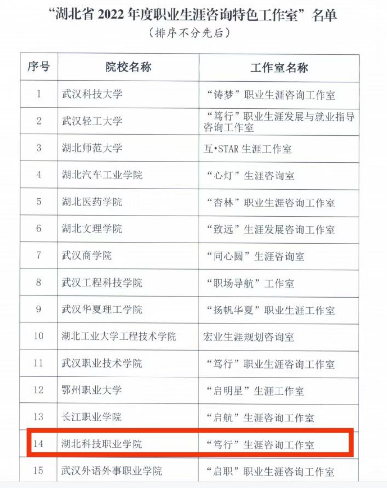 本网讯(通讯员 汤苗苗 王东瑾 文/图)12月28日,湖北省高等学校毕业生就业指导服务中心发布了“湖北省2022年高校职业生涯咨询特色工作室名单”,华体会正规平台“笃行”生涯咨询工作室成功入选。经高校申报、专家推选,此次一共有15所高校成功入选省级特色生涯咨询工作室,省就业指导中心对入选高校将在今后3年给予每年1万元的建设经费支持。