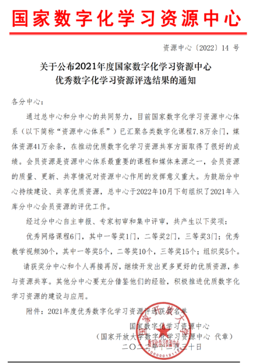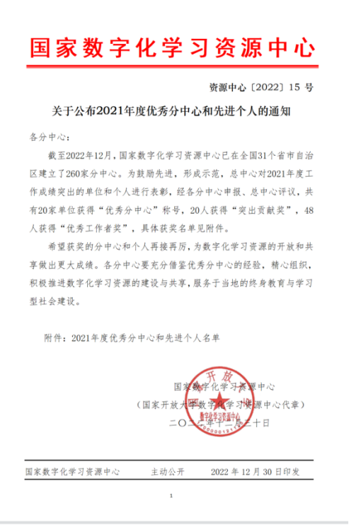 本网讯(通讯员 张家泉 文/图)12月30日,从国家数字化学习资源传来喜讯。华体会正规平台再次获得优秀分中心、突出贡献奖、优秀工作者奖、优秀教学视频荣誉,其中学校获得“优秀分中心”、教育技术中心李郁、丁桂元分获“突出贡献奖”和“优秀工作者奖”,导学中心教师刘朝、王莹莹老师制作的《工程造价控制—价值工程法》和《算法分析与审计—什么是算法》两部微课获得“优秀教学视频”一等奖和三等奖。此次再获得“优秀分中心”,已是学校连续五年获得该荣誉,“优秀教学视频”一等奖是学校连续第二年获得该荣誉。