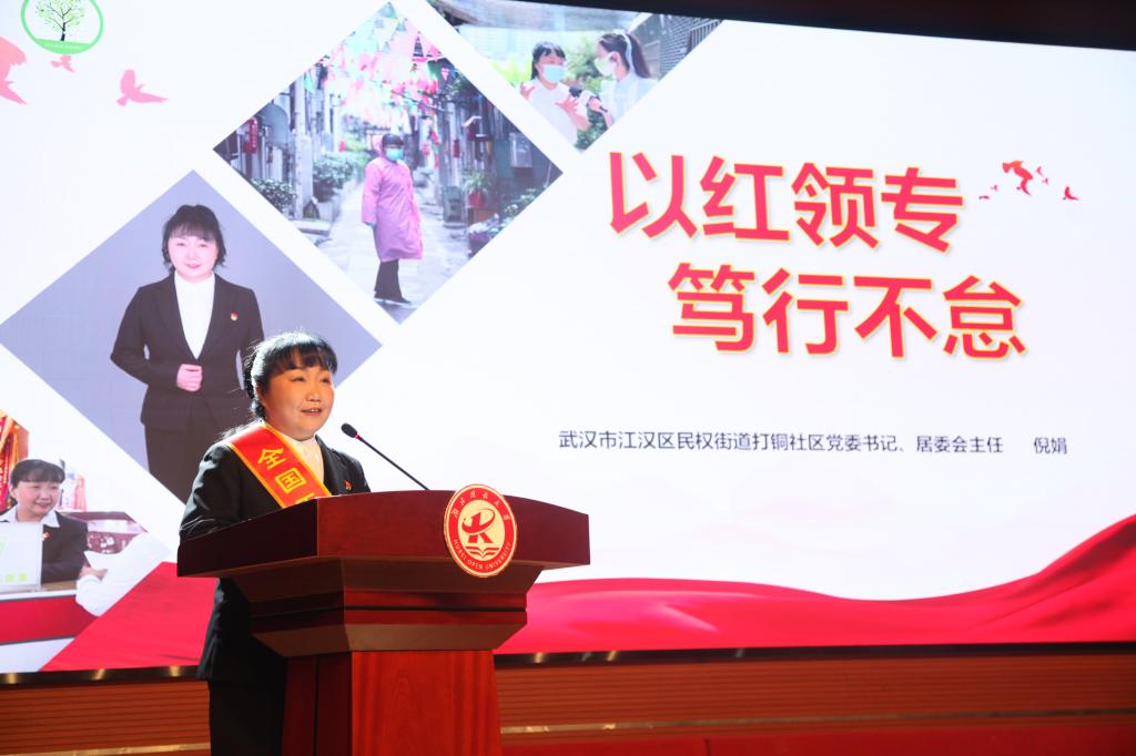 扎根基层立鸿鹄志,挥洒汗水做奋斗者,来自武汉市江汉区民权街道打铜社区的党委书记、全国五一巾帼标兵,全国“城乡社区抗疫巾帼先锋” 倪娟,扎根社区十五年,孵化培育社会组织,探索数字赋能道路,将“敬业、精益、专注、创新”的工匠精神发挥到极致,打造出老旧社区治理示范样板。她以《以红领专 笃行不怠》为主题,为宣讲学生传递了坚持党建引领,坚守为民初心的红色力量。