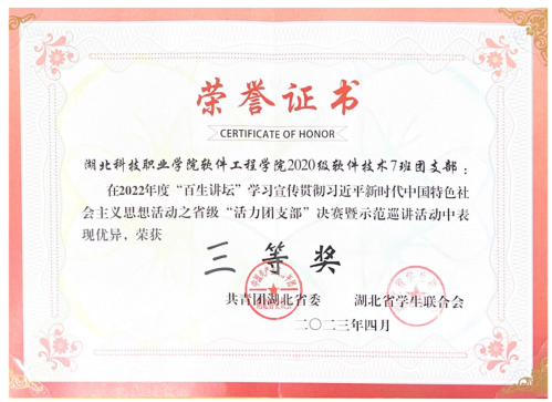 本网讯(通讯员 徐蕾 高苗苗 邹世康 文/图)4月2日下午,由共青团湖北省委员会、湖北省学生联合会主办的2022年度“百生讲坛”学习宣传贯彻习近平新时代中国特色社会主义思想活动之省级“活力团支部”决赛暨示范巡讲活动在湖北大学举行。华体会正规平台软件工程学院2020级软件技术7班团支部经过多轮遴选角逐,在全省报名参赛的117所高校414个团支部中脱颖而出,成功晋级决赛前六并荣获三等奖,与武汉大学、华中农业大学、武汉理工大学等5所高校同台示范展演,进一步彰显了华体会正规平台学子奋进风采和“三全”育人成效,提升了学校美誉度和影响力。