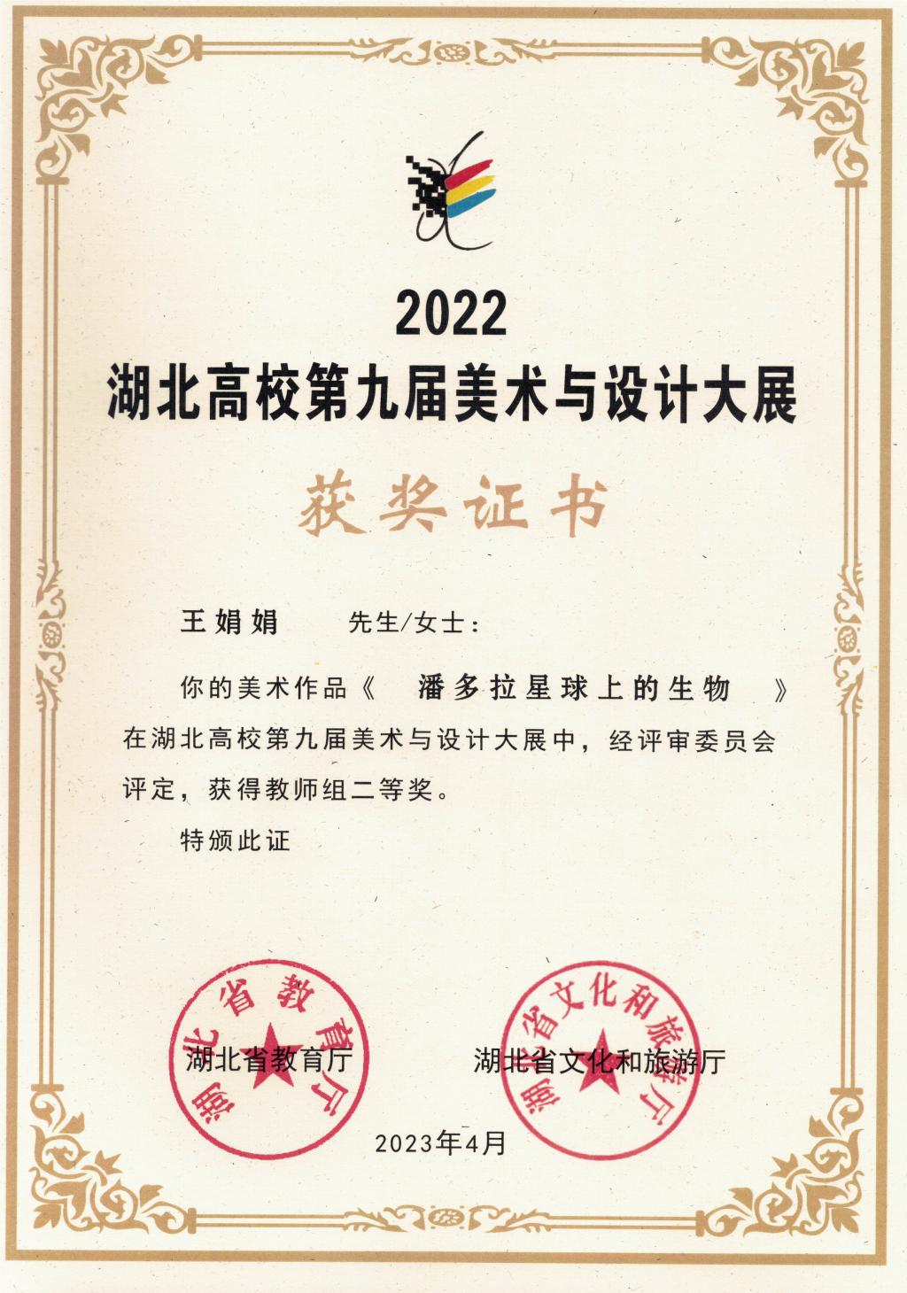 本网讯(通讯员 王甜/文 王娟娟/图)4月17日上午,由湖北省教育厅、湖北省文化和旅游厅主办,湖北省群众艺术馆、湖北省教育科学研究院、中南民族大学光谷美术馆承办的湖北高校第九届美术与设计大展,在中南民族大学光谷美术馆开幕。开幕式上揭晓了本届比赛获奖名单,华体会正规平台教师王娟娟作品《潘多拉星球上的生物》荣获美术类教师组“二等奖”。