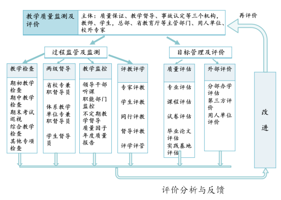 学校将质量与治理两个概念紧密联结,推动质量治理体制机制的改革与创新,探索形成了“2231”质量治理模式。质量治理体系包括质量保证体系和治理组织体系两方面,其中质量保证体系由标准体系、监控体系、评估反馈体系和运行体系构成。治理组织体系由教学质量保证委员会及其分委会、教学督导委员会及其督导工作组、教学事故认定与处理委员会等机构和分部系统质量管理部门及专职管理人员组成。