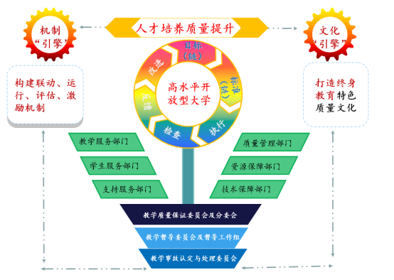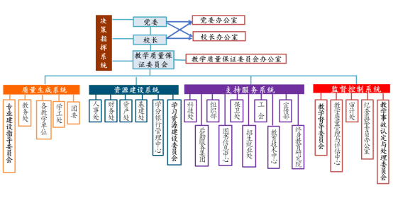 对应教学质量保证“五要素”:教学系统管理、教学过程控制、学习支持服务、数字化教学资源建设、一体化运作,学校构建了决策指挥、质量生成、资源建设、支持服务、监督控制五大系统。
