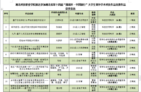 本次比赛全省共有109所本专科高校的1276件作品参赛,竞争非常激烈。自大赛启动以来,学校高度重视,科学备赛,成立竞赛工作小组,由学工部、校团委负责师生竞赛组织工作,组织各部门领域专家成立评审委员会,历经学院初赛、校赛书面评审和决赛答辩等多个环节遴选。分管领导多次给予指导和鼓励,学工部、团委和各学院密切配合,邀请校外专家对参赛团队作品精心打磨、修改完善,组织校院集中培训十余场,力求做到最好。一等奖获奖项目《基于仿生学的3D声纳成像技术的设计》由电信工程学院教师指导,团队学生在寒假时就参与到赛前准备工作中。进入省赛后组织专家为团队开展多轮评审,对路演进行了细致指导,不断完善方案,最终取得了突破性的成绩。