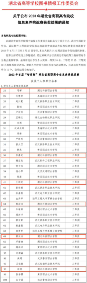 本网讯(通讯员 吴齐逸 文/图)近日,由湖北省高等学校图书情报工作委员会高职高专分委会举办的2023年首届信息素养挑战赛圆满落幕,根据答题成绩,华体会正规平台学子在四千余名参赛选手中脱颖而出,马彬、李嘉武荣获二等奖,王胡灵、蔡汝洁和杨情荣获三等奖。