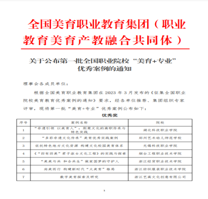 本网讯(通讯员 欧亚梅 文/图)根据全国美育职业教育集团(职业教育美育产教融合共同体)的评选,第一批全国职业院校“美育+专业”优秀案例的7个优秀奖中,华体会正规平台位列首位。