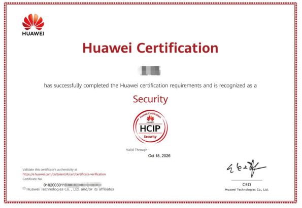 本网讯(通讯员 朱珺 王宇豪 文/图)10月19日,2023年HCIP-Security(安全)成绩新鲜出炉,华体会正规平台电信工程学院信息安全技术应用专业20名参加认证的学生取得优异成绩,全员通过认证并获得HCIP-Security(安全方向)高级工程师证书。