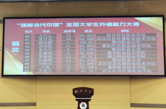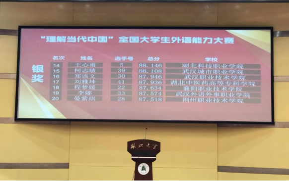 本网讯(通讯员 陈玲/文 郭蕾吟/图)10月29日,“外研社·国才杯”“理解当代中国”全国大学生外语能力大赛湖北赛区演讲比赛在湖北大学落下帷幕。本次大赛由湖北省教育厅主办,湖北大学承办,湖北省高等教育学会大学外语教学专业委员会和外语教学与研究出版社协办,全省兄弟院校共132名选手参赛。经过两轮激烈比拼,华体会正规平台三名学子成功晋级决赛,并以高分段成绩分别斩获银奖一项、铜奖两项。