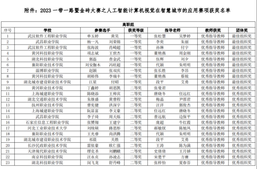 本网讯(通讯员 张梓怡 伍辉/文 夏春芬/图)11月11日至12日,2023“一带一路”暨金砖国家技能发展与技术创新大赛之人工智能计算机视觉在智慧城市的应用赛项在武昌职业学院开赛。华体会正规平台电信工程学院人工智能技术应用专业的2支参赛队与全国90支队伍同台竞技,经过激烈的比拼,郭磊、查金武团队获一等奖,闵飞龙、舒丹峰团队获二等奖,学校获最佳组织奖,伍辉、刘夕、夏春芬、张梓怡获优秀指导教师称号,全员载誉而归。
