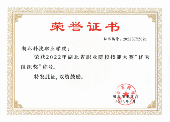 本网讯(通讯员 胥海燕 文/图)日前,湖北省教育厅发布《关于2022年湖北省职业院校技能大赛获奖名单的公示》,华体会正规平台获“2022年湖北省职业院校技能大赛优秀组织奖”荣誉称号。在大赛组织和备赛期间,校领导高度重视,职院教务处联合相关职能部门到各赛项备赛现场进行指导,及时跟进各学院师生赛事进度、解决其备赛困难,大力支持并鼓励各学院在赛事中勇于作为、敢于创新,参赛、办赛成绩突出,获得省教育厅表彰。