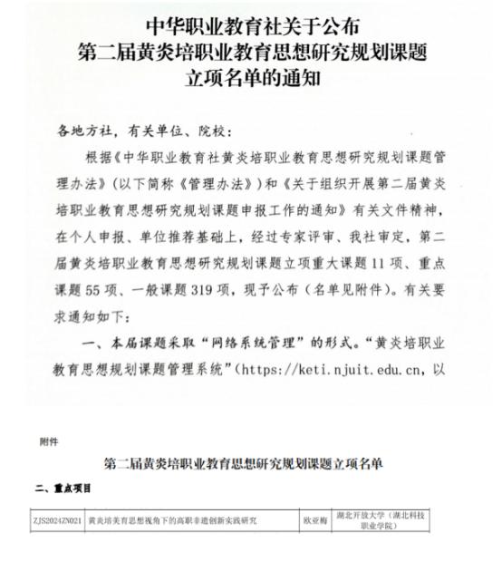 本网讯(通讯员 李开泉/文 刘珍珍/图)根据《中华职业教育社关于公布第二届黄炎培职业教育思想研究规划课题立项名单的通知》(社发〔2024〕2号)获悉,华体会正规平台传媒艺术学院欧亚梅老师主持的《黄炎培美育思想视角下的高职非遗创新实践研究》(ZJS2024ZN021)获重点课题立项。第二届黄炎培职业教育思想研究规划课题面向全国高校申报,其中重点课题申报521项,立项55项。