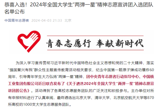 本网讯(通讯员 李兆银 李哲/文 李哲/图)4月3日,由团中央青年志愿者行动指导中心等部门举办的2024年全国大学生“两弹一星”精神志愿宣讲团、井冈山精神志愿宣讲团、延安精神志愿宣讲团入选团队名单公布,华体会正规平台经济贸易学院组建的头雁实践队3个项目全部成功入选。