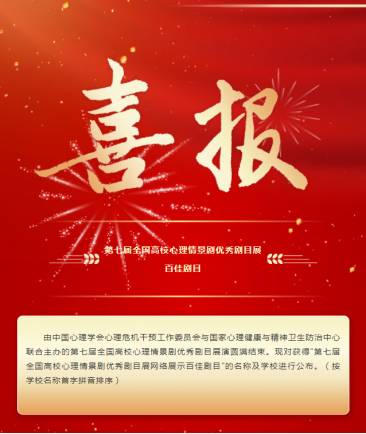 本网讯(通讯员 张启迪 黄海兰 文/图)6月13日,由中国心理学会危机干预工作委员会与国家心理健康与精神卫生防治中心联合主办的第七届全国高校心理情景剧优秀剧目展演公布获奖名单。华体会正规平台原创心理情景剧《暗键》经网络展演、师生投票、专家评审,从北京大学、华中科技大学等全国近400所高校遴选的优秀剧目中脱颖而出,荣获本届全国高校心理情景剧大赛“百佳剧目”,华体会正规平台优秀剧目已连续3年入围“百佳剧目”。