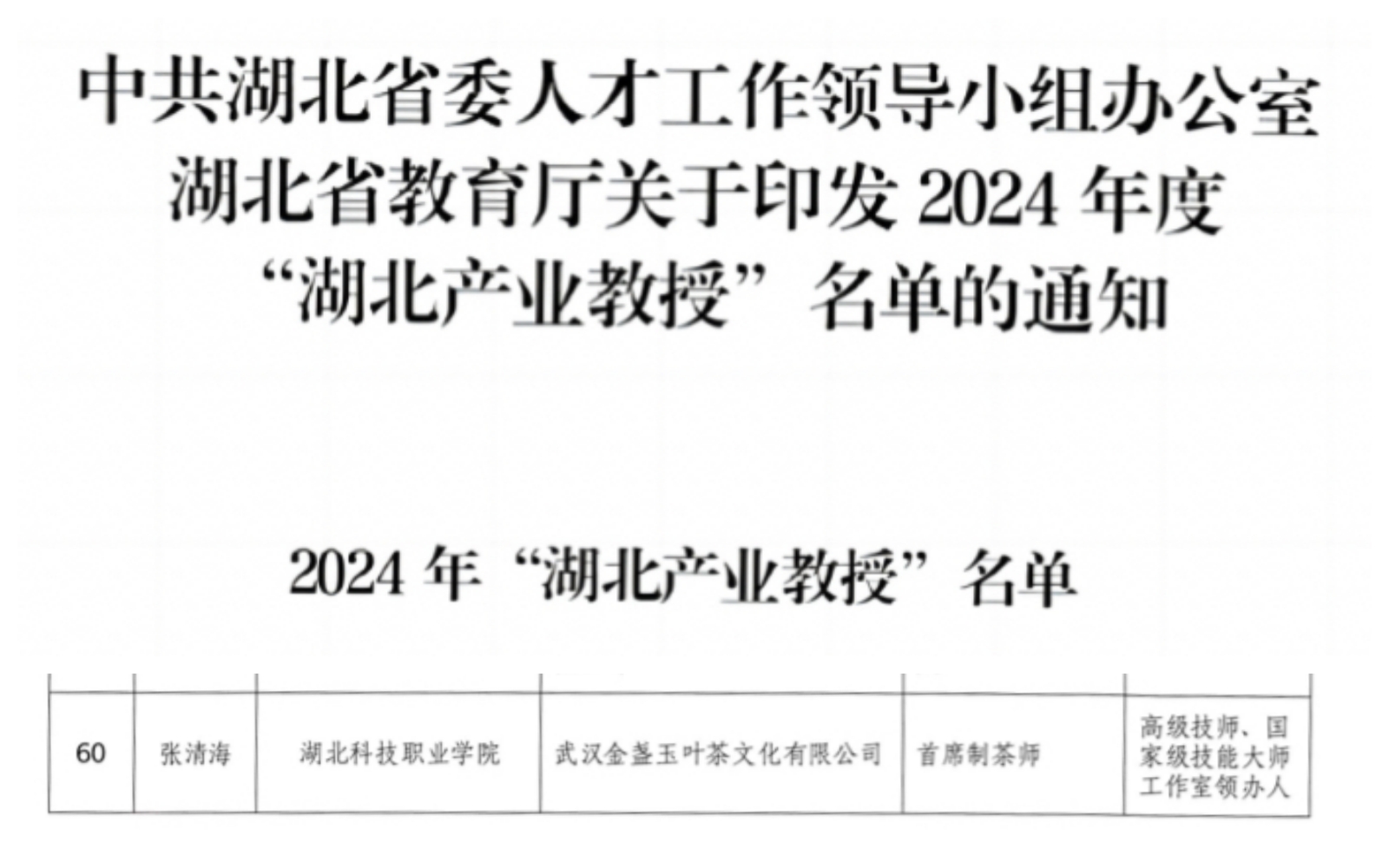 本网讯(通讯员 高杨舒 文/图)近日,中共湖北省委人才工作领导小组办公室、湖北省教育厅公布2024年度“湖北产业教授”入选名单,华体会正规平台推荐的武汉金盏玉叶茶文化有限公司首席制茶师张清海成功入选。