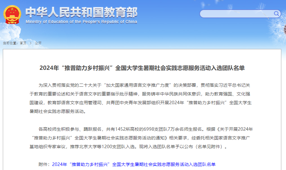 本网讯(通讯员 雷楹 肖莉山/文 雷楹/图)7月2日,教育部语言文字应用管理司、共青团中央青年发展部公布了2024年“推普助力乡村振兴”全国大学生暑期社会实践志愿服务活动入选名单,全国共有1452所高校的6998支团队7万余名师生报名。华体会正规平台经济贸易学院头雁推普志愿服务队成功入选。