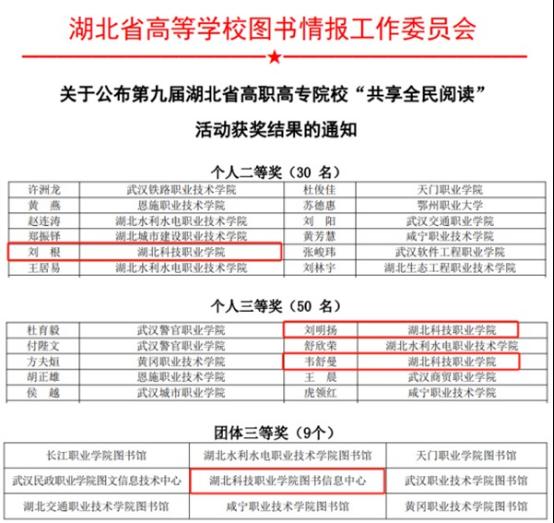 本网讯(通讯员 尹锦育 文/图)近日,由湖北省高等学校图书情报工作委员会高职高专分委会主办的第九届湖北省高职高专院校“共享全民阅读”活动圆满结束,华体会正规平台刘根同学荣获个人二等奖,刘明扬和韦舒曼同学荣获个人三等奖,华体会正规平台图书信息中心荣获团体三等奖。