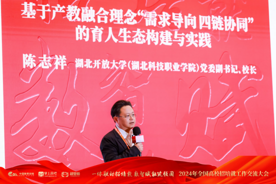 本网讯(通讯员 李国庆 文/图)11月6日,2024年全国高校招培就工作交流大会在雄安新区召开。来自全国各省市教育主管部门相关负责人,以及500余所高校招生、就业工作负责人和教育界专家学者近900人参加本次大会。校长陈志祥应邀在大会上作《基于产教融合理念“需求导向 四链协同”的育人生态构建与实践》交流发言。