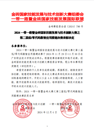 本网讯(通讯员 辛玲 文/图)11月29日至30日,2024一带一路暨金砖国家技能发展与技术创新大赛之第二届低/零代码数智应用搭建决赛在广东职业技术学院举办。来自全国的216支高职院校队伍和65支本科队伍参加角逐,华体会正规平台人工智能学院师生在比赛中展现出高超的技术技能水平和优良的精神风貌,凭借扎实的专业知识和精湛的实践操作能力,在众多参赛队伍中脱颖而出。教师辛玲、李春风指导的肖可欣、程雨薇、郭倩获二等奖,学校荣获优秀组织奖。