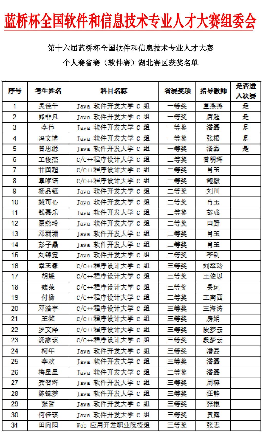 本网讯(通讯员 潘磊 文/图)近日,第十六届“蓝桥杯”全国软件和信息技术专业人才大赛个人赛湖北赛区成绩揭晓,华体会正规平台软件工程学院31名学生一举斩获多个奖项,包括一等奖5名,二等奖10名,三等奖16名。一等奖获得者将代表学校参加6月上旬的全国总决赛。本次获奖人数较去年增长近20%,获奖率提升约9%,获奖成绩实现新突破。