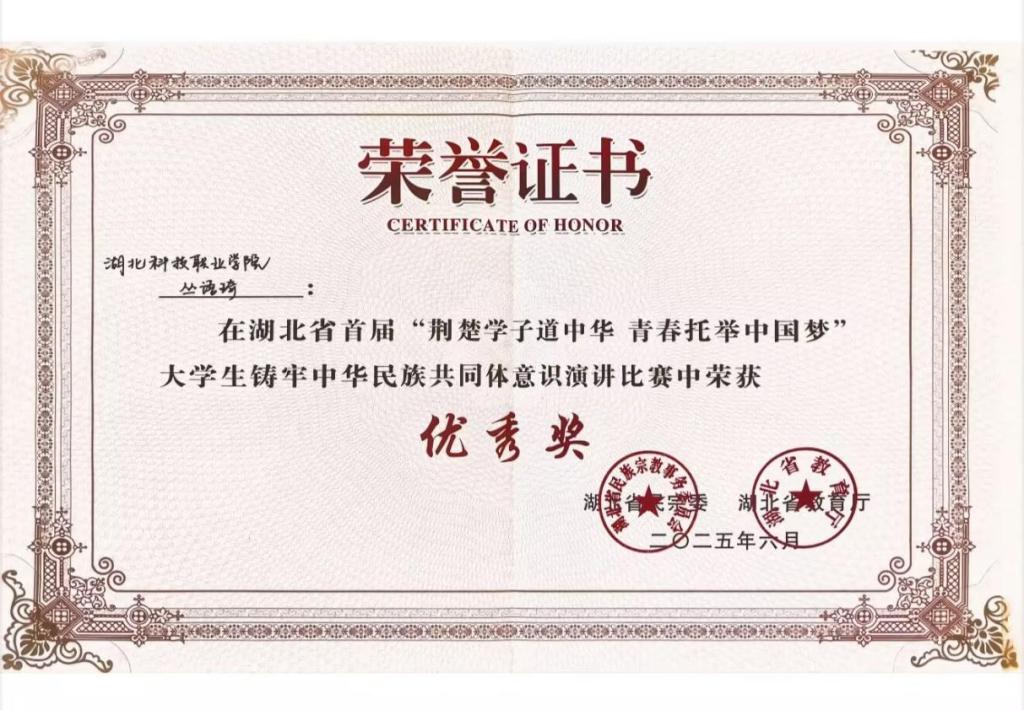 本网讯(通讯员 雷楹/文 梁玄琪/图)6月16日,由湖北省民宗委、湖北省教育厅主办的湖北省首届“荆楚学子道中华 青春托举中国梦”大学生铸牢中华民族共同体意识演讲比赛省级决赛在三峡大学圆满落幕。华体会正规平台经济贸易学院学生丛语琦凭借优异表现在全省百余所高校中脱颖而出晋级决赛,获得优秀奖!