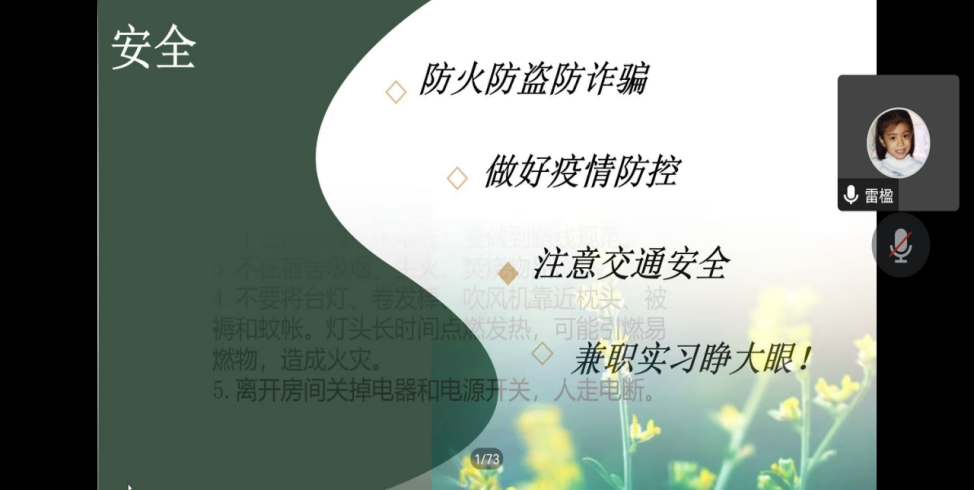 召开学工例会专题部署学生寒假安全工作,组织学习学校寒假学生教育管理工作的通知,细化落实假期疫情防控和安全教育,确保详实掌握学生动态数据,坚持学生日报、零报数据准时准确;元旦前各班级召开寒假安全主题教育,通过QQ班级群和今日校园向学生发布《高等学校寒假安全温馨提示》,全面落实寒假学生安全工作。