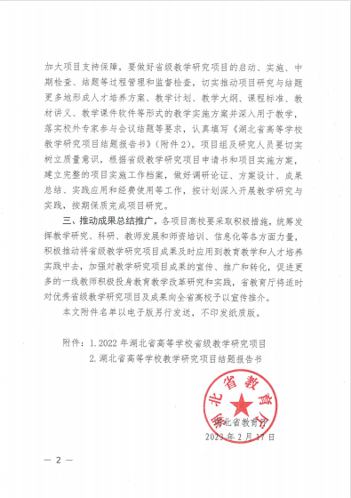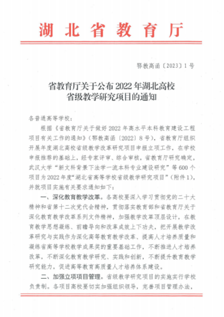 本网讯(通讯员 詹乐 文/图)2月11日,省教育厅公布了2022年度湖北省教学研究项目名单,华体会正规平台推荐申报的2022年湖北高校省级教学研究项目获批立项2项:机电工程学院教师付强《高职石油工程专业课程思政教学实践与创新路径研究》、工商管理学院教师李智《“乡村振兴”背景下湖北高职院校专业结构优化调整的路径与策略》。