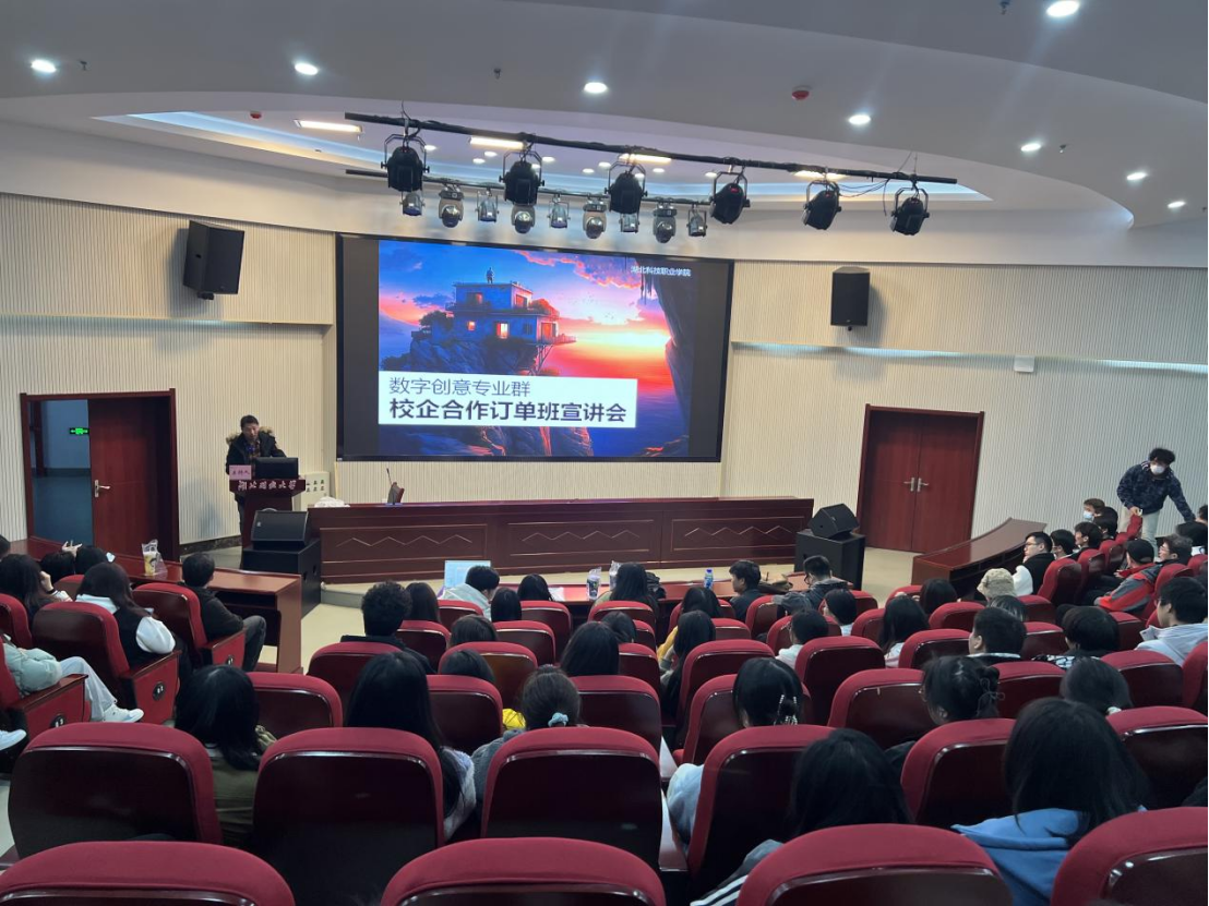 本网讯(通讯员 刘超/文 张幸 严可祎/图)2月20日,传媒艺术学院校企合作订单班宣讲会在报告厅举行。经过学院认真遴选,武汉水静科技有限公司、武汉修明数字科技有限公司、武汉幻城数字科技有限公司、武汉时空立方数字科技有限公司等四家校企合作单位来校就“校企合作订单班”进行宣讲。数字文化创意专业群全体教师及237名学生参加宣讲会。专业群负责人刘超主持宣讲会。