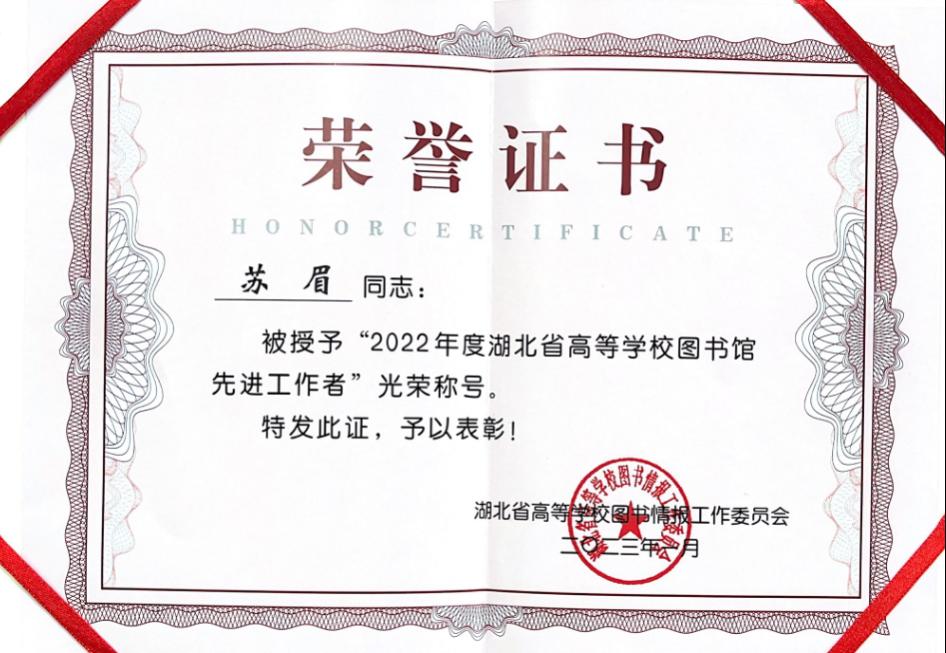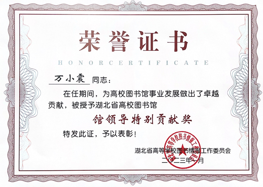 本网讯(通讯员 苏眉 文/图)近日,湖北省高等学校图书情报工作委员会在湖北咸宁组织召开“2023年湖北省高校图书馆馆长工作研讨会”。会议期间对获奖图书馆进行了表彰,华体会正规平台图书信息中心主任万小震荣获 “馆领导特别贡献奖”,馆员苏眉荣获“2022年度湖北省高等学校图书馆先进工作者”光荣称号。