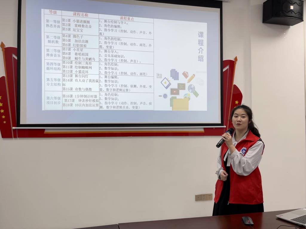活动开始,“雏鹰计划”学生党员干部苏雅雯以游戏的方式带领孩子们体验编程的魅力,详细介绍了“什么是编程”“编程的作用”等。在实践教学开始前,她带领小朋友了解了为期1个月教学课程体系以及通过系列课程学习后所能收获的知识与技能。