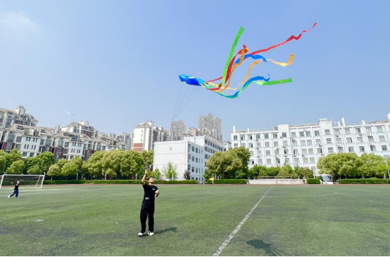 一根风筝线,就可以将身心交付于蓝天。师生们个个精神十足,全心投入,三五成群地在操场上奔跑着、欢呼着、呐喊着,托举、助跑、加速、放线、抽线一气呵成,大家纷纷开始展示起这熟悉的童年“手艺活儿”。“好风凭借力,送我上青云”,在大家齐心协力的合作下,色彩斑斓、形状各异的风筝成功与蓝天拥抱,在空中翩翩起舞。更有学生着汉服襦裙看鸢飞蝶舞,青春与传统碰撞,春景与国学共振双倍快乐,给春天里的自己加一层“文化滤镜”