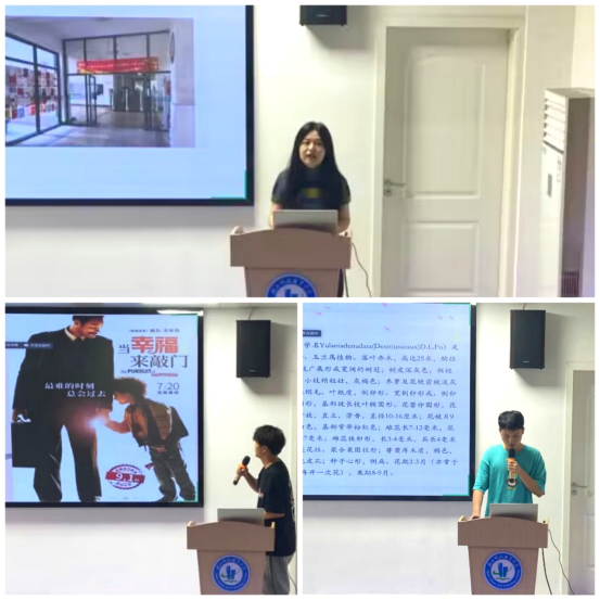 图书信息中心罗小路详细介绍了图书检索办法和借阅指南,并预告“阅享春光、品味书香”读书节活动。机电工程学院王俊杰、软件工程学院肖琦琪两位学生分别就校园生长的《玉兰科植物》和高评分电影《当幸福来敲门》进行了分享。