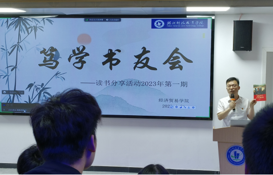 经济贸易学院党总支书记冷磊向学生们推荐了《习近平与大学生朋友们》,介绍了该书的出版背景和内容纲要。他结合自己的学习体会,希望大家读出信念有理想、读出自信敢担当、读出方向能吃苦、读出力量肯奋斗,号召学生们牢记习近平总书记的教导,既仰望星空又脚踏实地,用奋斗书写最美的青春。