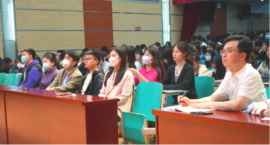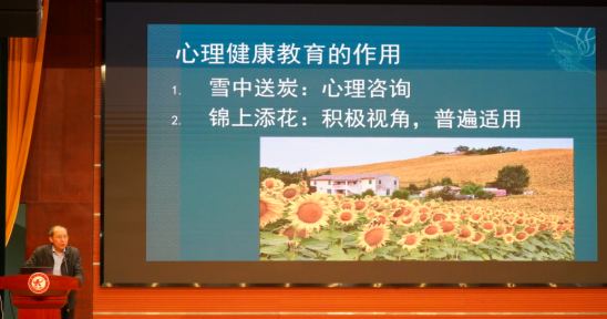 他强调:一要乐群。先育德再育才,鼓励学生与同龄人交往,培养人的社会性。人生不是跑百米,而是跑马拉松,大家需要有长远的战略眼光,要在群体中成长,成为有家国情怀,有责任担当的时代青年。二要乐业。要学会克服对学业、事业的疲倦心理,提升对事物的感受力,将注意力集中在当下去感受。通过视频短片和具体案例,指出要对所做的事情赋予更高的意义。三要乐意。心理健康主要是内心和谐、人际和谐、环境和谐。他号召同学们要利用课余时间多体验,增加人生感受,提升接受挫折的能力,才能不断增强心理素质,平衡自我与他人、环境的关系。