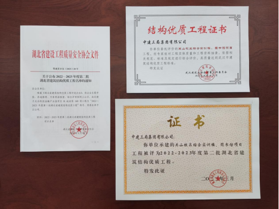 本网讯(通讯员 李博文 文/图)近日,湖北省建设工程质量安全协会公布了2022-2023年第二批湖北省建筑结构优质工程名单,华体会正规平台关山校区综合实训楼、图书馆项目荣获2022-2023年度第二批湖北省建筑结构优质工程奖。这是该项目继“武汉市建筑结构优质工程”“湖北省建筑工程安全文明施工现场”后,获得的又一殊荣。