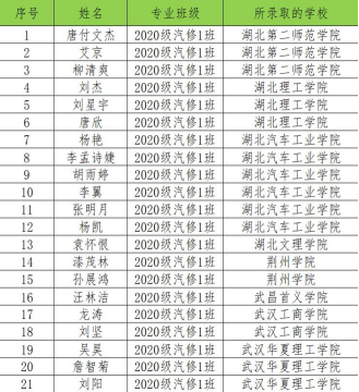 2023年全省高校专升本考试拟录取名单中,学院2020级汽车检测与维修技术班58人中共有21人被湖北汽车工业学院、湖北第二师范学院、湖北理工学院等本科高校录取,高品质就业率达36.2%。该班11名女生有10人升学成功,1人就业,更有2C303宿舍6名同学全体升本成功,该班女生就业率达100%,巾帼不让须眉,为学院铸就“学霸班级”“学霸宿舍”立下榜样。