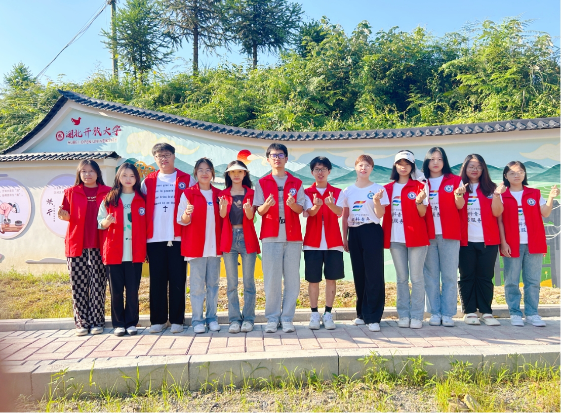 志愿服务团队成员在墙画前合影留念