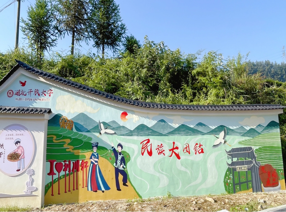 这个暑假,志愿者们将画笔、颜料、画板带到了五二村,在一张白墙上演绎了一堂生动的社会实践课。绘制墙画前,大家反复商讨绘画主题和风格,在村干部的带领下,实地参观了村子,详细了解了村里的房屋风格、茶园布局、人文风俗和民族服饰,最终结合当地实际情况,确定了以茶园、五二新村桥、利川红茶、幸福石、民族大团结字样等为元素的墙画,同时选定了绘制地点,为绘画工作做好了充分的准备。