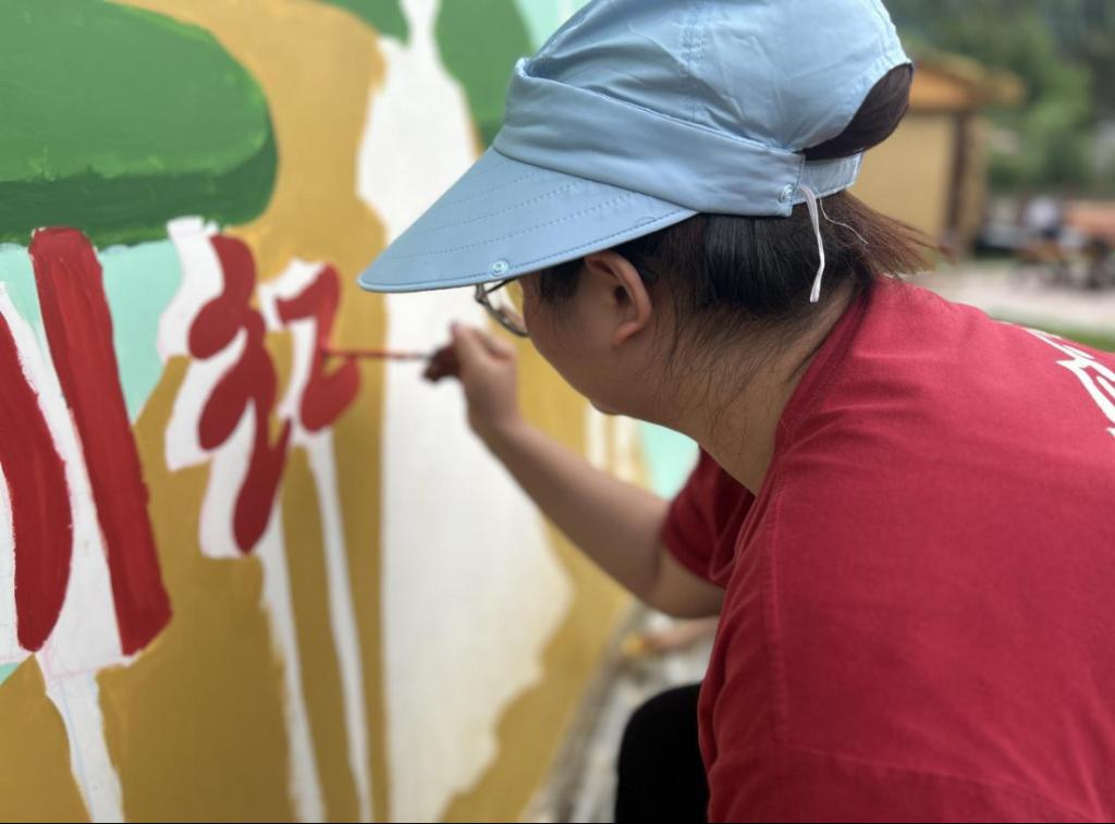 志愿者给墙体上色