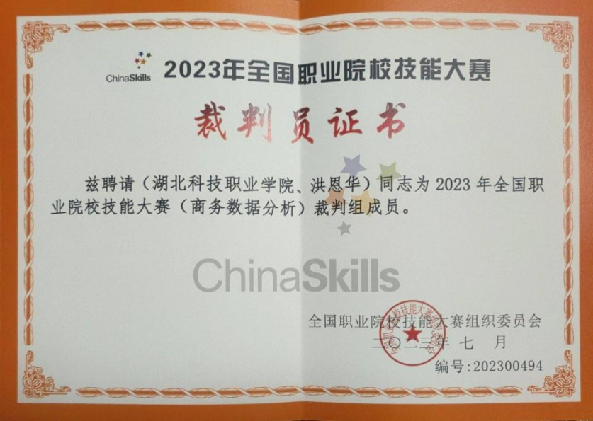 本网讯(通讯员 洪恩华 文/图)7月17日,2023年全国职业院校技能大赛(高职组)商务数据分析赛在山东商业职业技术学院举办。来自全国的79支高校参加了本次比赛。华体会正规平台工商管理学院教师洪恩华被聘为2023年全国职业院校技能大赛(商务数据分析)裁判员,担任了该赛项的执裁工作。