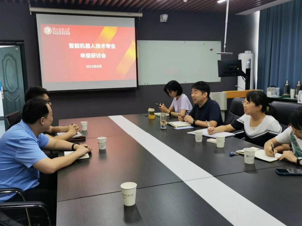 本网讯( 通讯员 吕林 文/图)8月24日上午,为进一步推动学校专精特新产业学院以及人工智能技术应用专业群建设,电信工程学院与江苏汇博机器人技术股份有限公司就智能机器人技术新专业申报进行了深入研讨。汇博湖北区唐剑锋经理和产品部帅新宇经理参加了此次研讨,电信工程学院院长涂家海、副院长陈小艳、相关专业负责人和骨干教师参会。