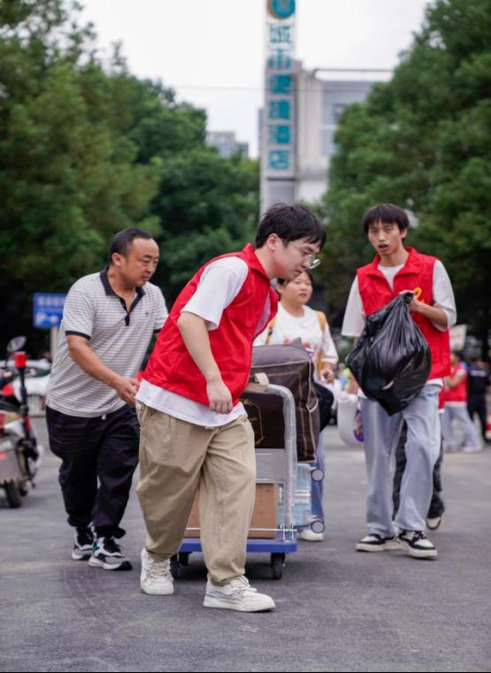 为了保证开学工作顺利进行,学校安排学生错峰到校报到,大学生志愿者倾注爱心和奉献,在服务中贴“新”、温馨高效。他们将一袋又一袋的行李、一箱又一箱的衣物和物品搬运到宿舍,来回穿梭在校园中,他们活跃的身影,在校园里呈现了一道团结互助友爱靓丽风景线。