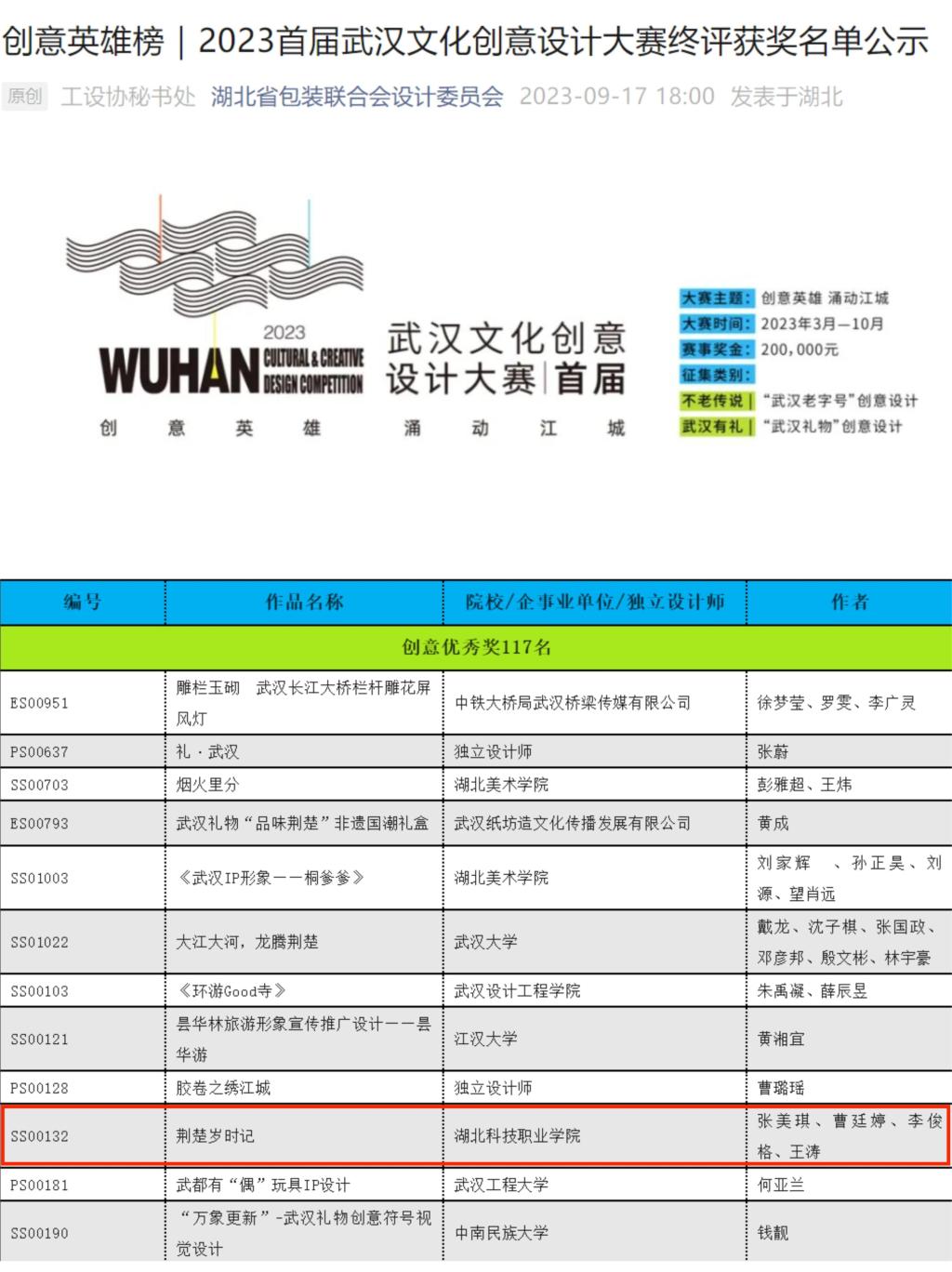 本网讯(通讯员 徐凌帆 文/图)“创意英雄 涌动江城”,在2023武汉首届文化创意设计大赛中,华体会正规平台学生与各大高校、独立设计师、设计机构和单位同台竞技,终评获奖名单于9月17日公示。华体会正规平台传媒艺术学院徐凌帆、沈娟、李芳老师指导的艺术设计专业学生作品《荆楚岁时记》获得创意优秀奖。