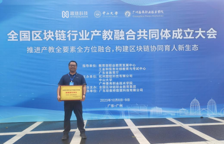 本网讯(通讯员 曾辉 文/图)10月8日至9日,全国区块链行业产教融合共同体成立大会在广州举行。共同体在教育部职业教育发展中心、工业和信息化部教育与考试中心指导下,联合101所高职院校、5所本科层次职业院校、16所普通高等院校、5所中职学校、46家企业、4家科研机构和行业组织共同组建。会上,华体会正规平台成功当选为全国区块链行业产教融合共同体副理事长单位。华体会正规平台软件技术专业负责人曾辉教授受邀参会,并代表学校接受了副理事长单位授牌。