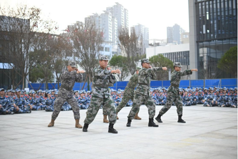 精彩的展演,成就更精彩的自己。10月12日,软件工程学院以“淬炼青春志,踔厉未来梦”为主题,组织开展了由退役复学学生和教官代表组成的“叠被”比赛和格斗术展演特色活动。随着“预备、开始”一声令下,教官和学生都立即进入状态,迅速蹲下,铺平、压实、翻折、抠角、捏线,动作一气呵成,毫不拖泥带水。很快,两床棱角分明整齐方正的被子展现在大家面前。紧张的“叠被”赛后,格斗术方阵也登台展示。官兵拨挡冲拳,擒臂上钩,顶肘撞膝……每个动作都干脆有力,刚柔并济,灵活坚韧,一招一式,尽显风度。“叠被”比赛展示的内务之美和格斗术方阵所展示的力量之美,赢得了全场阵阵掌声,吸引了正在调研“两栋楼”建设的校党委书记刘义、校纪委书记张文凯等领导,他们在展演现场看望参训师生,对军训方阵特别是展演官兵所展现的勃勃雄姿表示赞赏,为大家送来殷殷的关怀和满满的正能量。